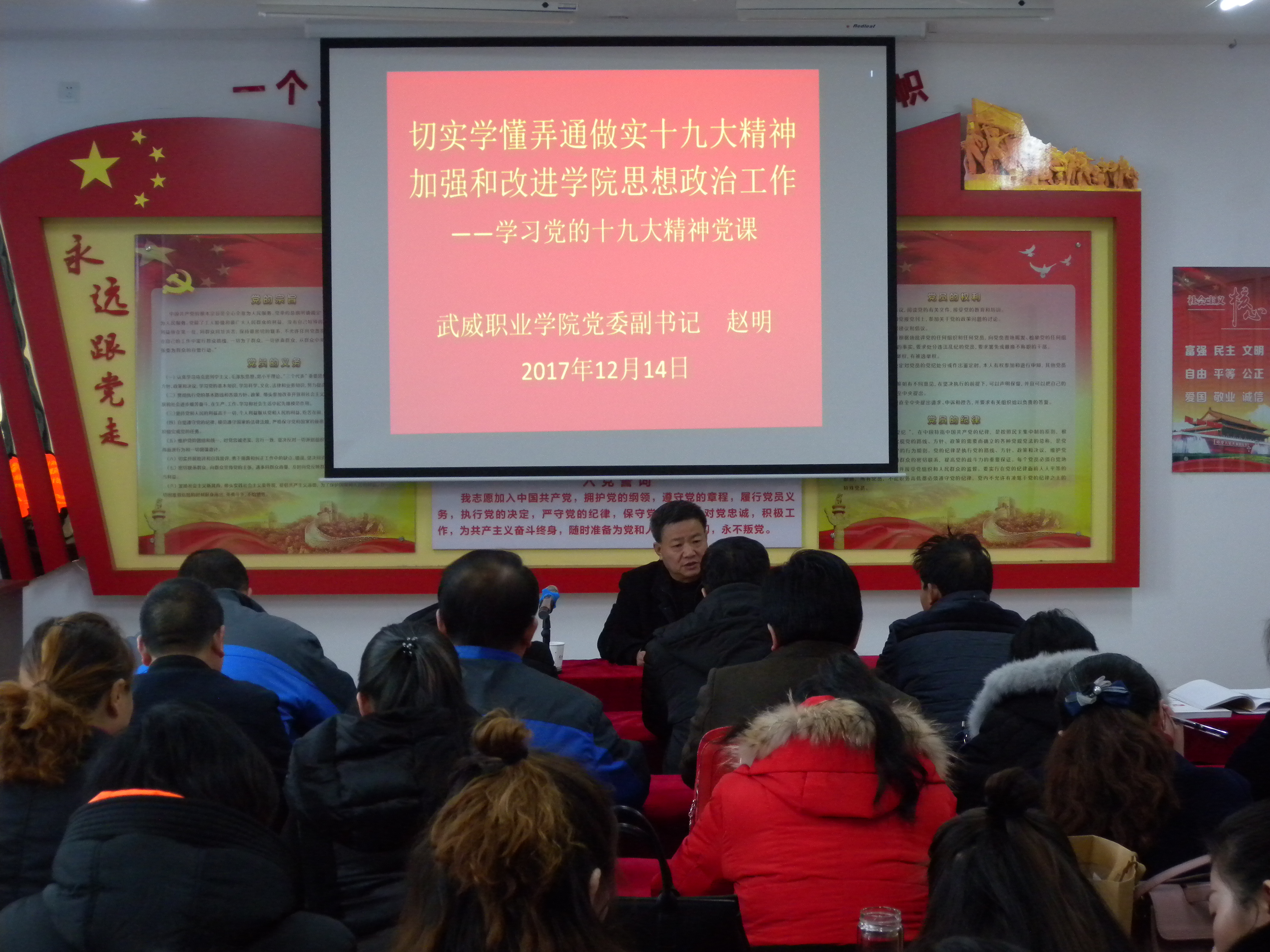12月14日下午,人文藝術(shù)教育系黨總支邀請(qǐng)學(xué)院黨委副書記趙明同志到我系、馬克思主義學(xué)院講黨課,趙明同志結(jié)合自身學(xué)習(xí)十九大及習(xí)近平總書記在全國(guó)高校思想政治工作會(huì)議上的講話精神體會(huì),做了題為《切實(shí)學(xué)懂弄通做實(shí)十九大精神? 加強(qiáng)大學(xué)生思想政治工作》的黨課,全體教師聆聽(tīng)了黨課。