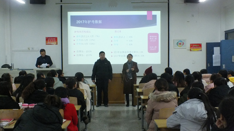 為了進一步提高我系學生的專業(yè)水平和護考過關率,讓2018屆畢業(yè)生更好地應對護士資格考試,12月20日晚,護理系在明遠樓211教室舉辦了以護考為主題的講座,15級護理、助產專業(yè)共100余人聆聽了此次講座。護理系黨總支書記張建輝、系主任韓曉萍參加講座并講話。