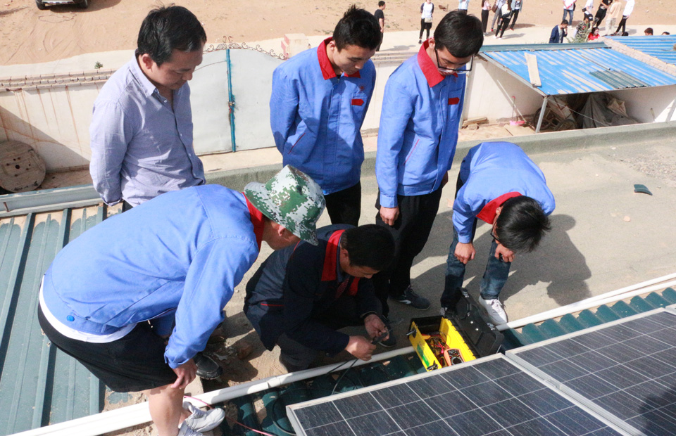 走進圓夢新村,由學院校辦企業(yè)武威泰豐新能源有限公司建設的200戶貧困家庭戶均3kw的分布式光伏發(fā)電系統(tǒng)映入眼簾。在社區(qū)書記郭林春的帶領(lǐng)下,黨員教師和學生入黨積極分子上門幫助用戶檢查維修光伏發(fā)電設備,檢查光伏組件的老化跡象以及所有連接器是否連接緊密、有無腐蝕現(xiàn)象,檢查組件是否接地良好。了解農(nóng)戶的需求,為農(nóng)戶講解光伏設備后期維護、電費結(jié)算方式以及國家扶貧惠民的政策等知識,并對部分農(nóng)戶屋頂光伏組件故障進行了排除,對光伏組件進行了大面積清潔維護。