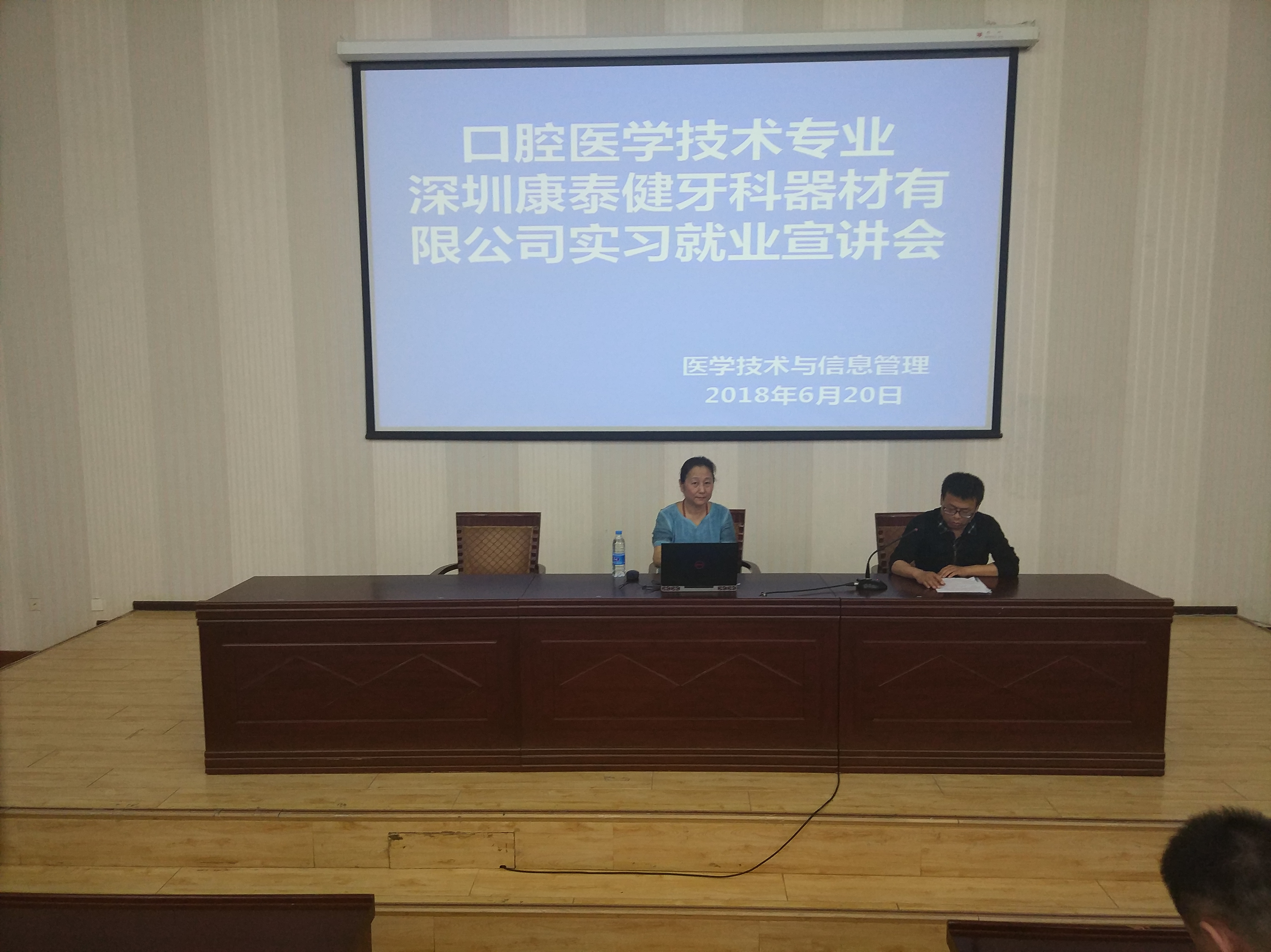 6月20日,醫(yī)學(xué)技術(shù)與信息管理系邀請(qǐng)深圳市康泰健牙科器材有限公司在正德廳召開企業(yè)實(shí)習(xí)就業(yè)宣講。參加宣講會(huì)的有康泰健牙科器材有限公司培訓(xùn)學(xué)校校長(zhǎng)辛金紅,口腔技術(shù)專業(yè)教研室全體老師,在校口腔醫(yī)學(xué)技術(shù)專業(yè)學(xué)生。宣講會(huì)由系副主任蔡濟(jì)眾主持。