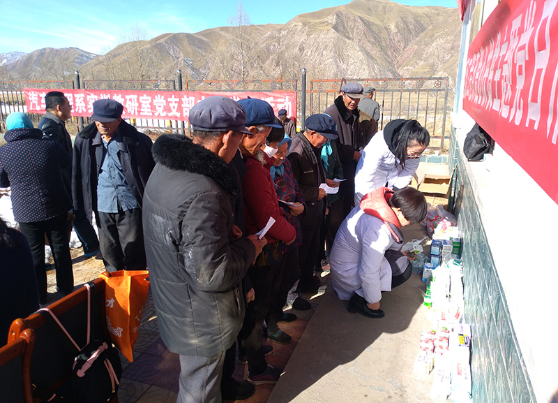 到達(dá)目的地后,黨員們不顧辛勞,分成兩組,一組由護(hù)理系黨總支書記張建輝帶領(lǐng)前往臥病在床的扶貧對象家里,親切詢問病情及家里近況,送上常備藥品。另一組在當(dāng)?shù)卮宀窟M(jìn)行義診活動,醫(yī)護(hù)人員仔細(xì)給村民們進(jìn)行體檢,耐心解答、細(xì)心診治;對前來問診的村民認(rèn)真進(jìn)行血壓、血糖、丙肝等項(xiàng)目的檢測、免費(fèi)發(fā)放藥品并對糖尿病、高血壓等慢性病的飲食、活動和用藥進(jìn)行指導(dǎo),普及衛(wèi)生常識和健康知識。醫(yī)護(hù)人員的精心服務(wù)讓村民們倍感欣慰,受到了他們的熱烈歡迎和一致稱贊。