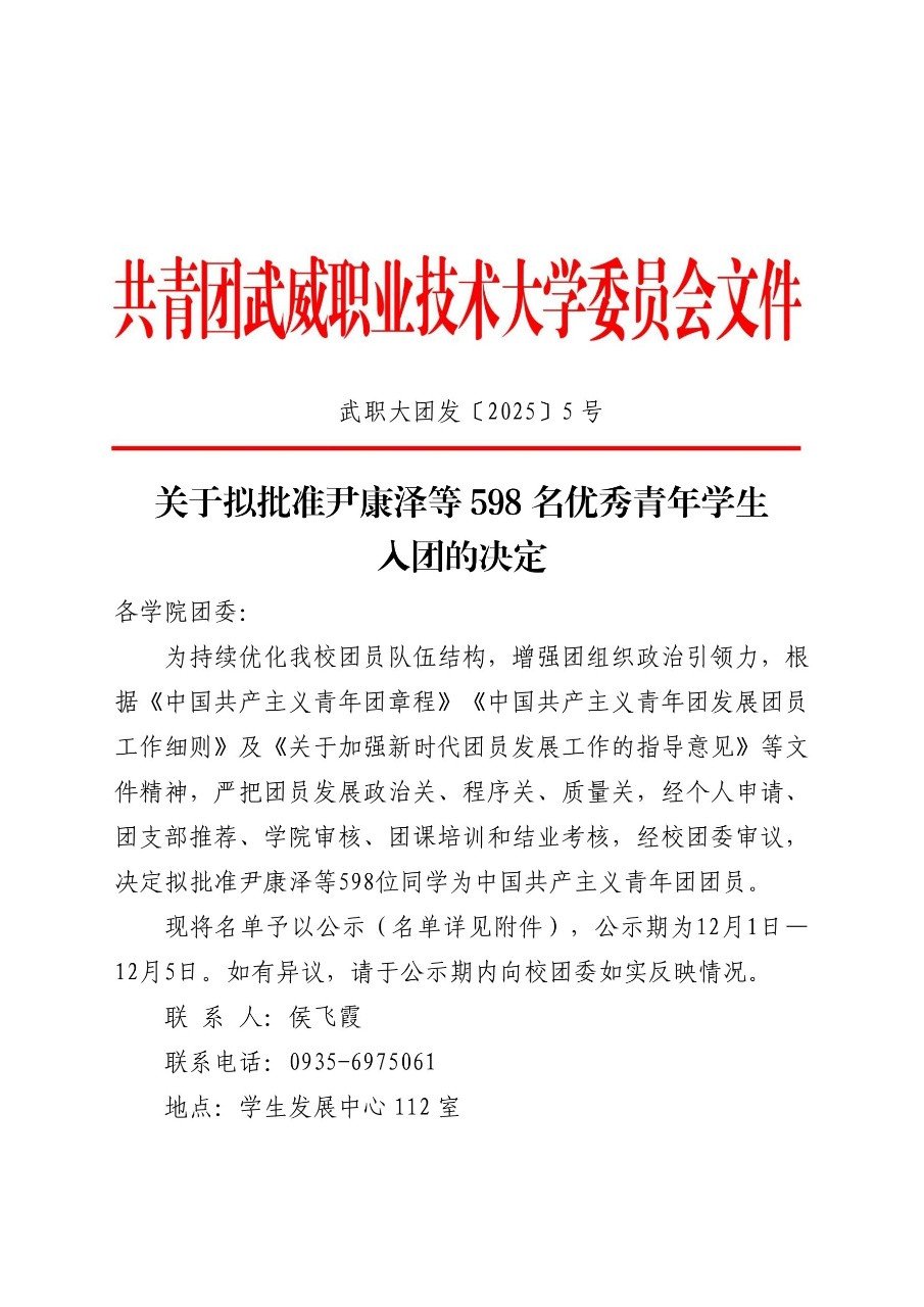 關(guān)于擬批準尹康澤等598名優(yōu)秀青年學生入團的決定